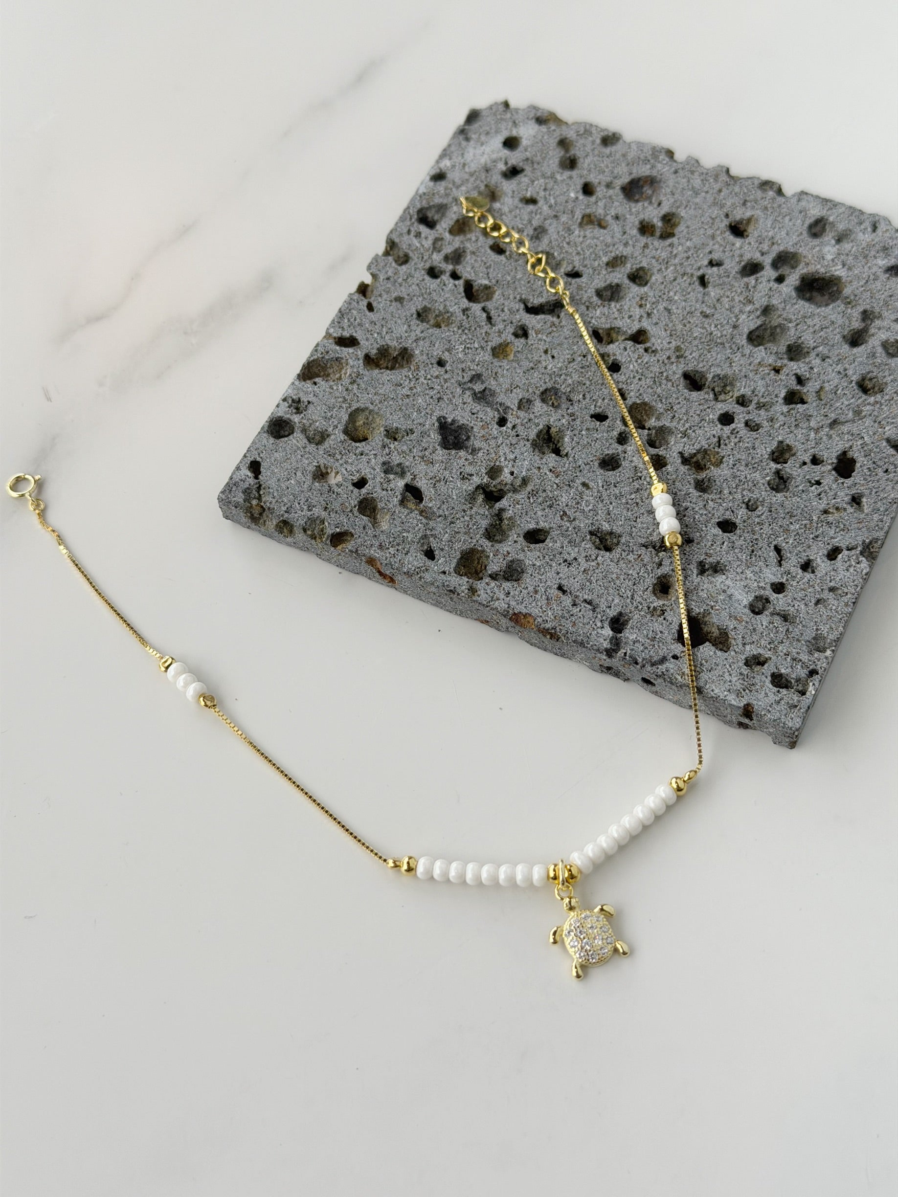 Silver 925 Gold plared Turtle design Anklet With White beads